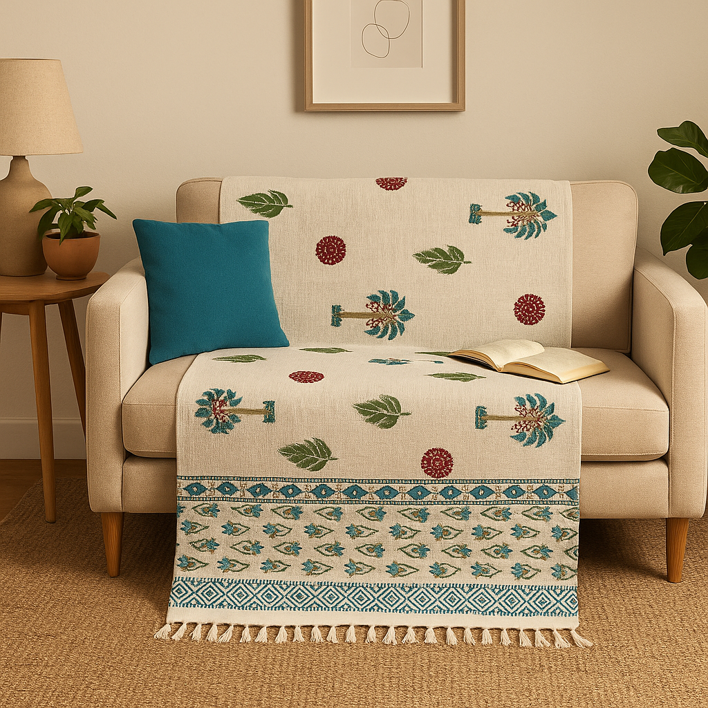 Bring a sense of calm and earthy charm to your living space with Our Hand block printed Tassel Throw. Crafted with care from soft, breathable cotton, this throw features a subtle yet elegant design inspired by nature, making it a perfect addition to any room.