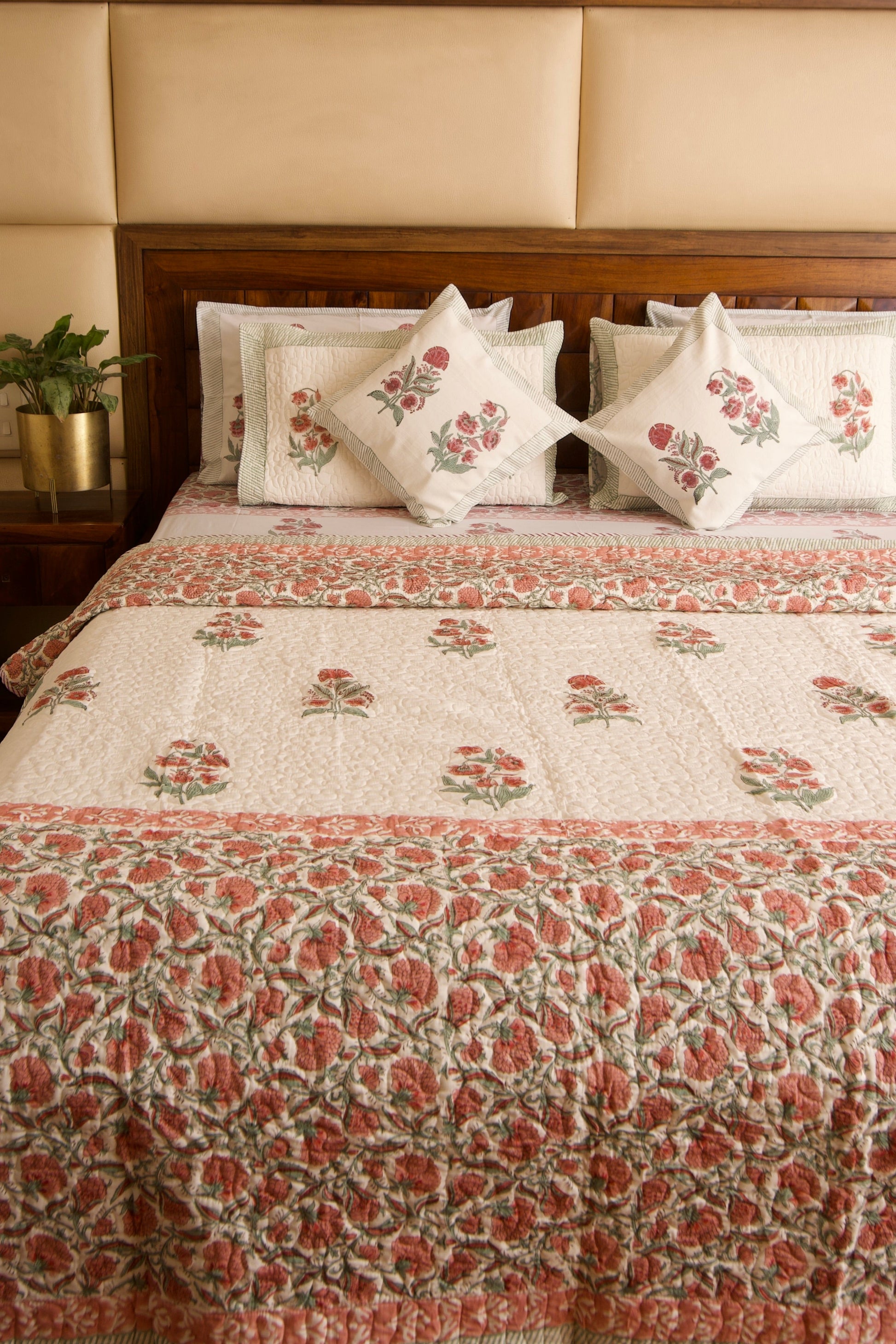 Experience ultimate comfort and elegance with our organic percale pure cotton 300 TC bedsheet paired with a matching exquisitely soft and cozy hand-quilted, block-printed mulmul cotton quilt.
