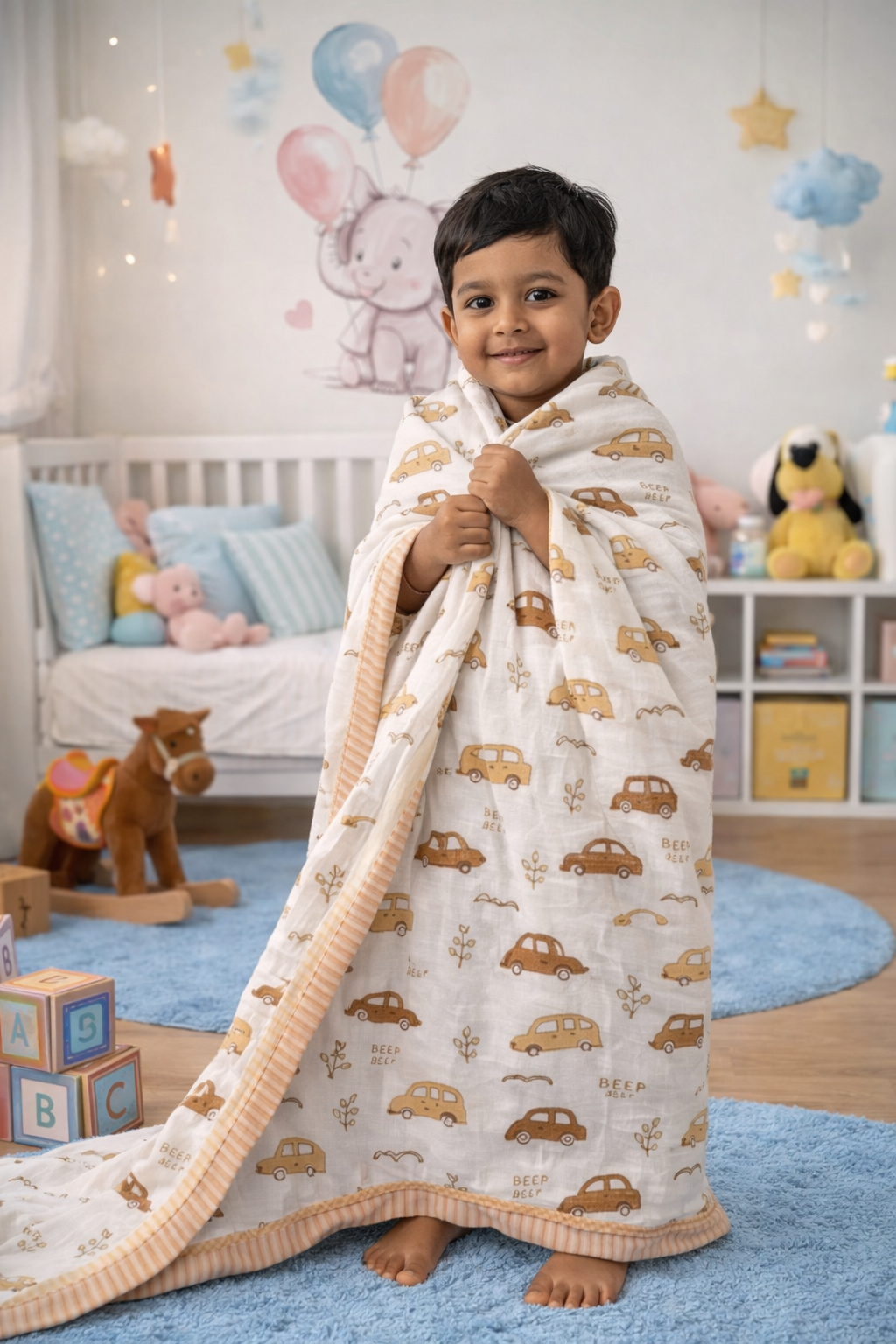 Our Reversible Baby Dohar with cute motifs has a hand printed that gives it a truly artistic touch. Adorned with beautiful block print backing, each motif is hand block printed against the solid white background. It is made with the softest organic cotton mulmul fabric soft against your little one’s skin, filled with a layer of sheet and two layers of breathable mulmul keeps the baby appropriately warm.