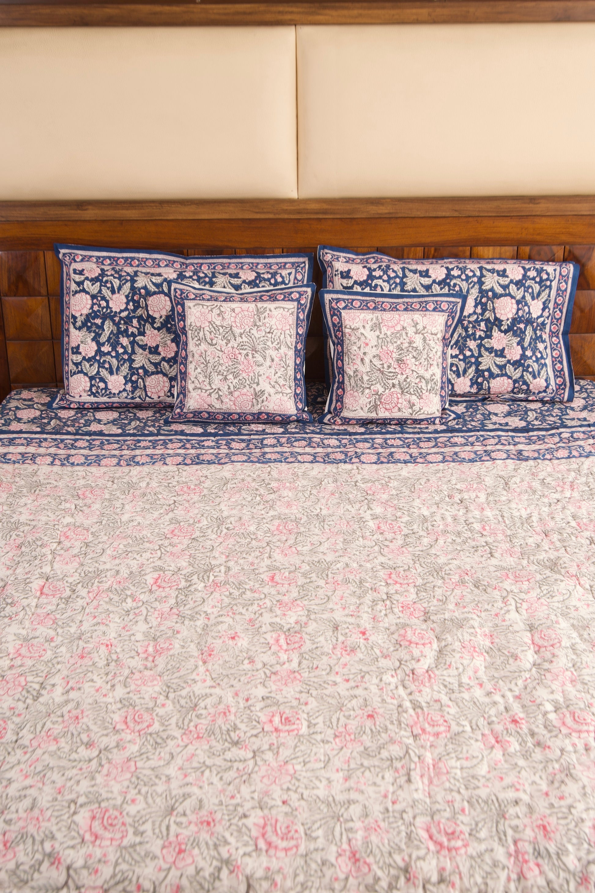 Imagine snuggling beneath a quilt that's not just luxuriously soft and breathable, but also a canvas of vibrant artistry and sustainable craftsmanship. That's the magic of a hand-block printed organic mulmul cotton quilt with 100% plant based surgical cotton filling. Paired with our Percale cotton 300TC Bedsheet.