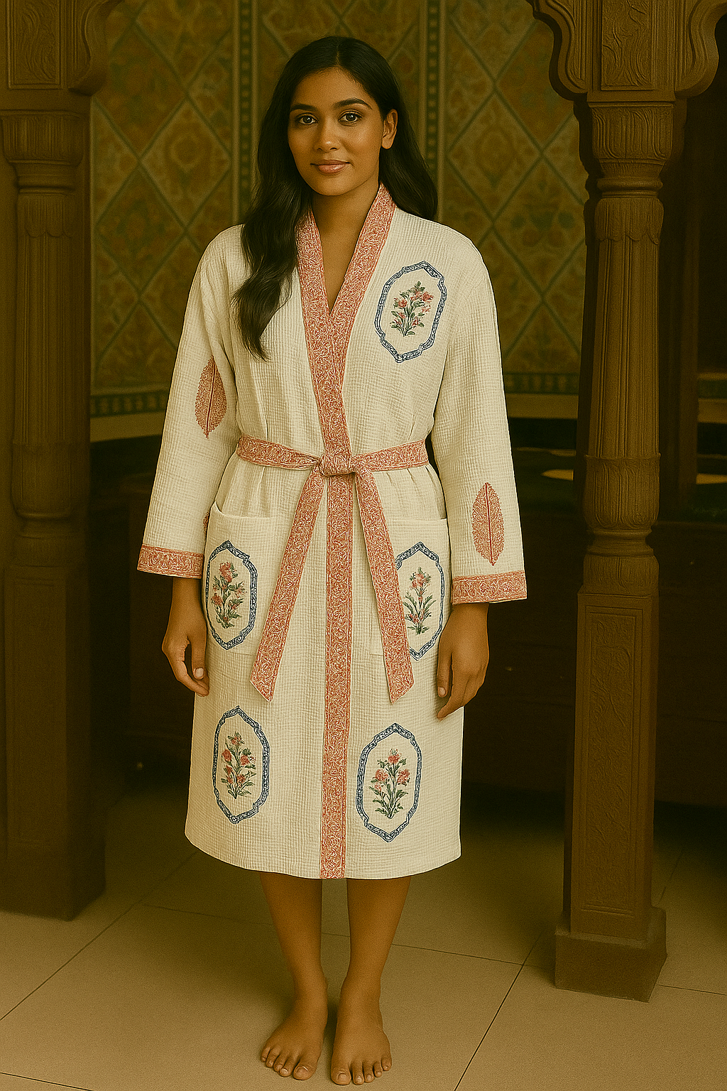 This is a beautiful soft waffle cotton Hand block printed bathrobe. The design and comfort combined will surely make this a favorite with everyone. This bathrobe can be the perfect gift for your loved ones.