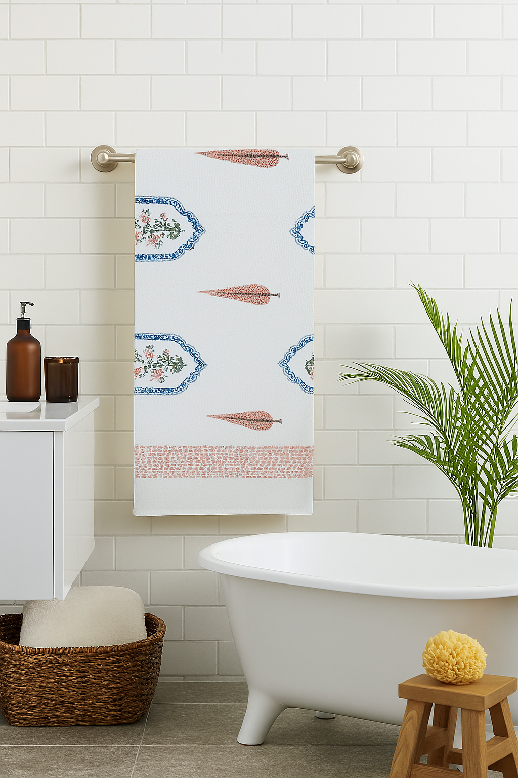 Pep up you bathing experience with our intricate block printed body towel set with vibrant colors paired with free size bathrobes, makes a wonderful gift for someone special.