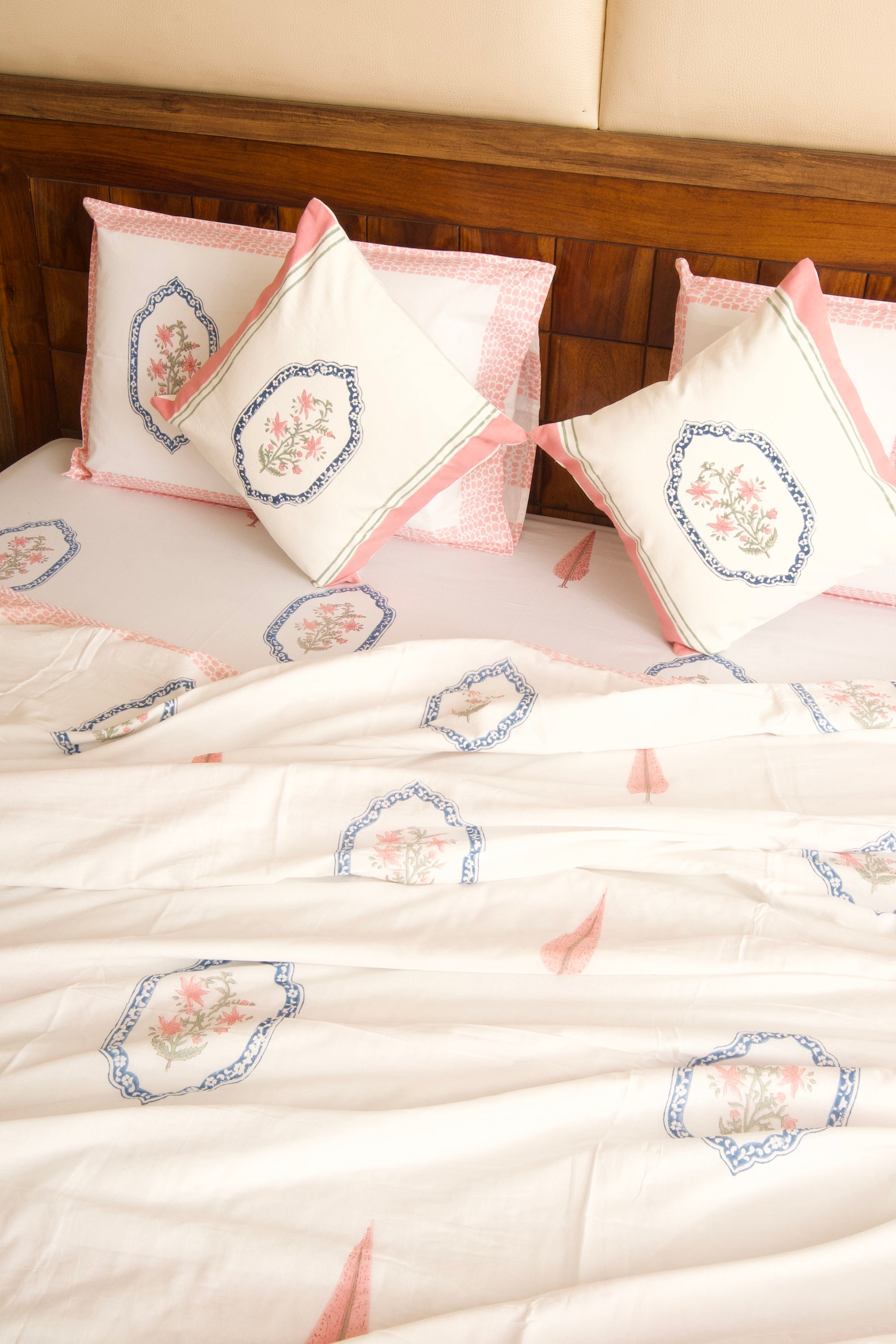 Pink Blue Jasmine Mirror Bedsheet & Dohar Set
