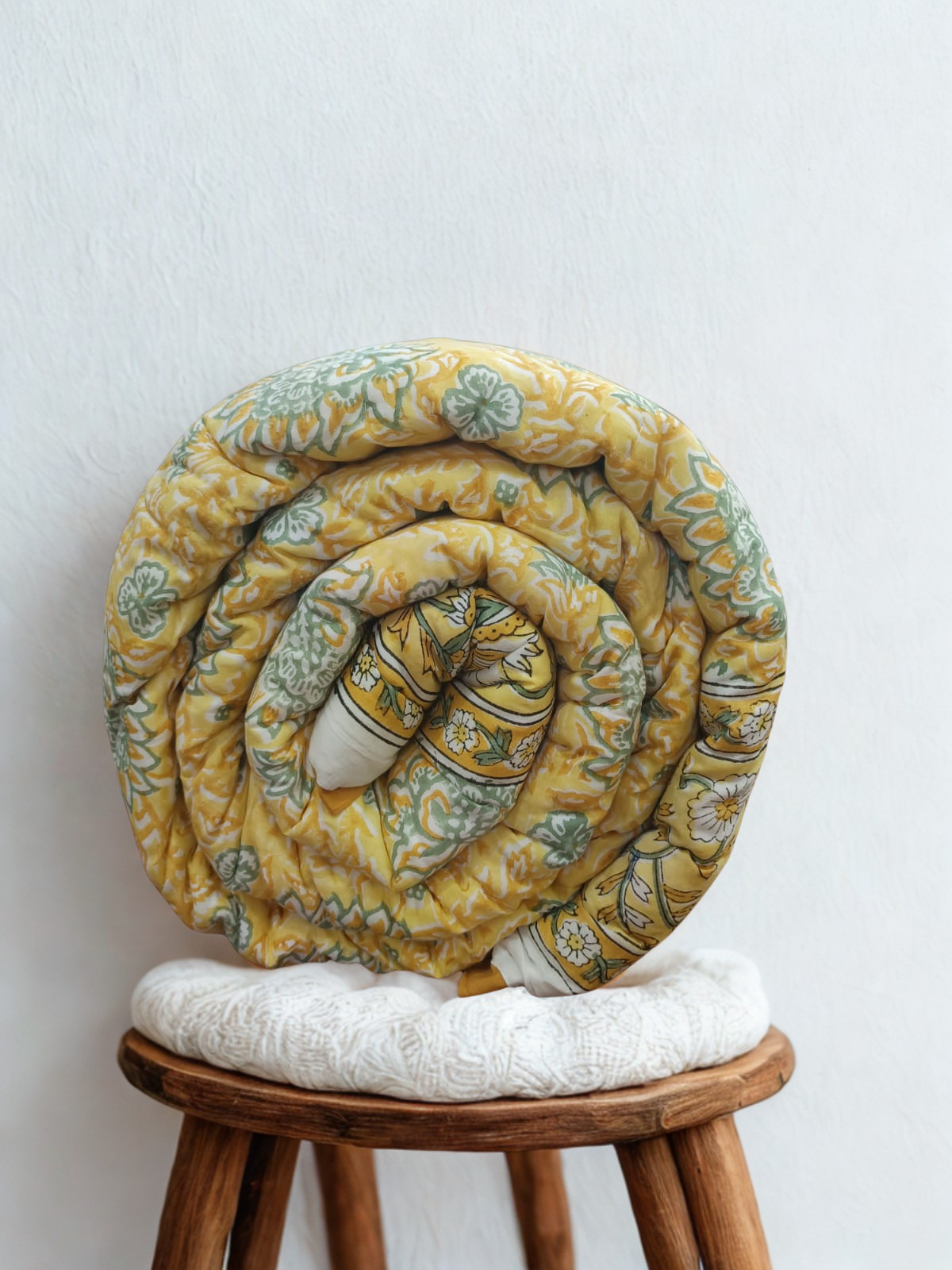 Imagine snuggling beneath a quilt that's not just luxuriously soft and breathable, but also a canvas of vibrant artistry and sustainable craftsmanship. That's the magic of a hand-block printed organic mulmul cotton quilt with 100% plant based surgical cotton filling.